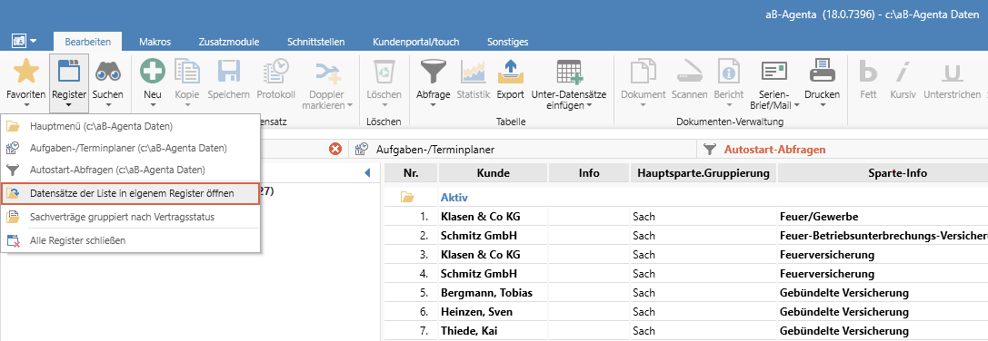 Mit Hilfe der neuen Funktion „Datensätze der Liste in eigenem Register öffnen“ entfällt das manuelle öffnen. Nachdem Sie die Liste z. B. über den Abfrage-Assistent generiert oder die Autostart-Abfrage aufgerufen haben, klicken Sie auf Register – „Datensätze aus der Liste in eigenem Register öffnen“.